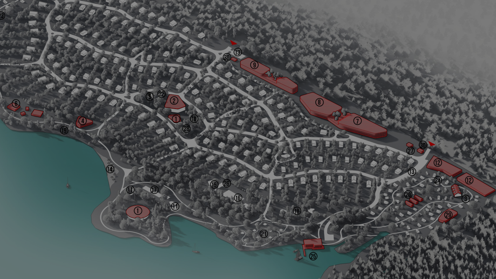 и игровые зоны для детей. Здесь также будут обустроены: верёвочный парк, корты для большого тенниса, поле для мини-гольфа. Опоясывает всю территорию вело-лыжная дорожка длиною 2,5 км.